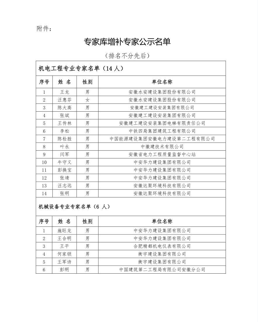 关于安徽省安装和机械设备协会增补第三届专家库专家名单的公示