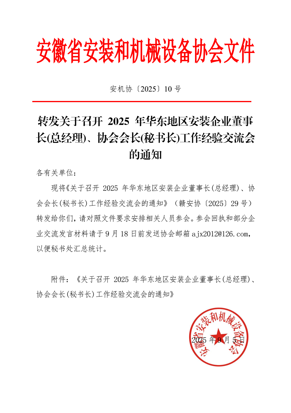 转发关于召开 2025 年华东地区安装企业董事长(总经理)、 协会会长(秘书长)工作经验交流会的通知