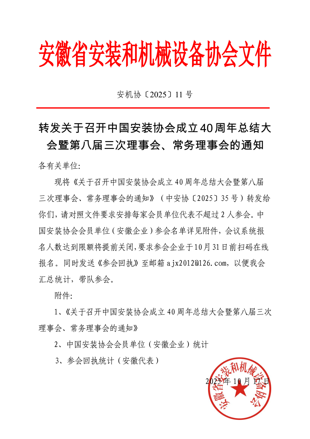 转发关于召开中国安装协会成立40周年总结大会暨第八届三次理事会、常务理事会的通知