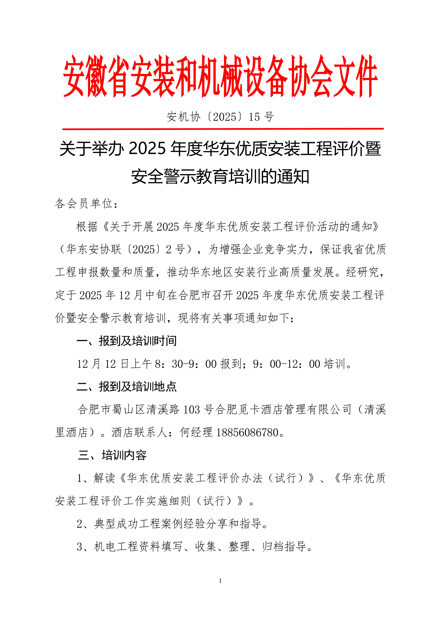 关于举办2025年度华东优质安装工程评价暨安全警示教育培训的通知