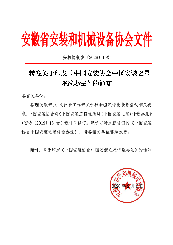 转发关于印发《中国安装协会中国安装之星评选办法》的通知